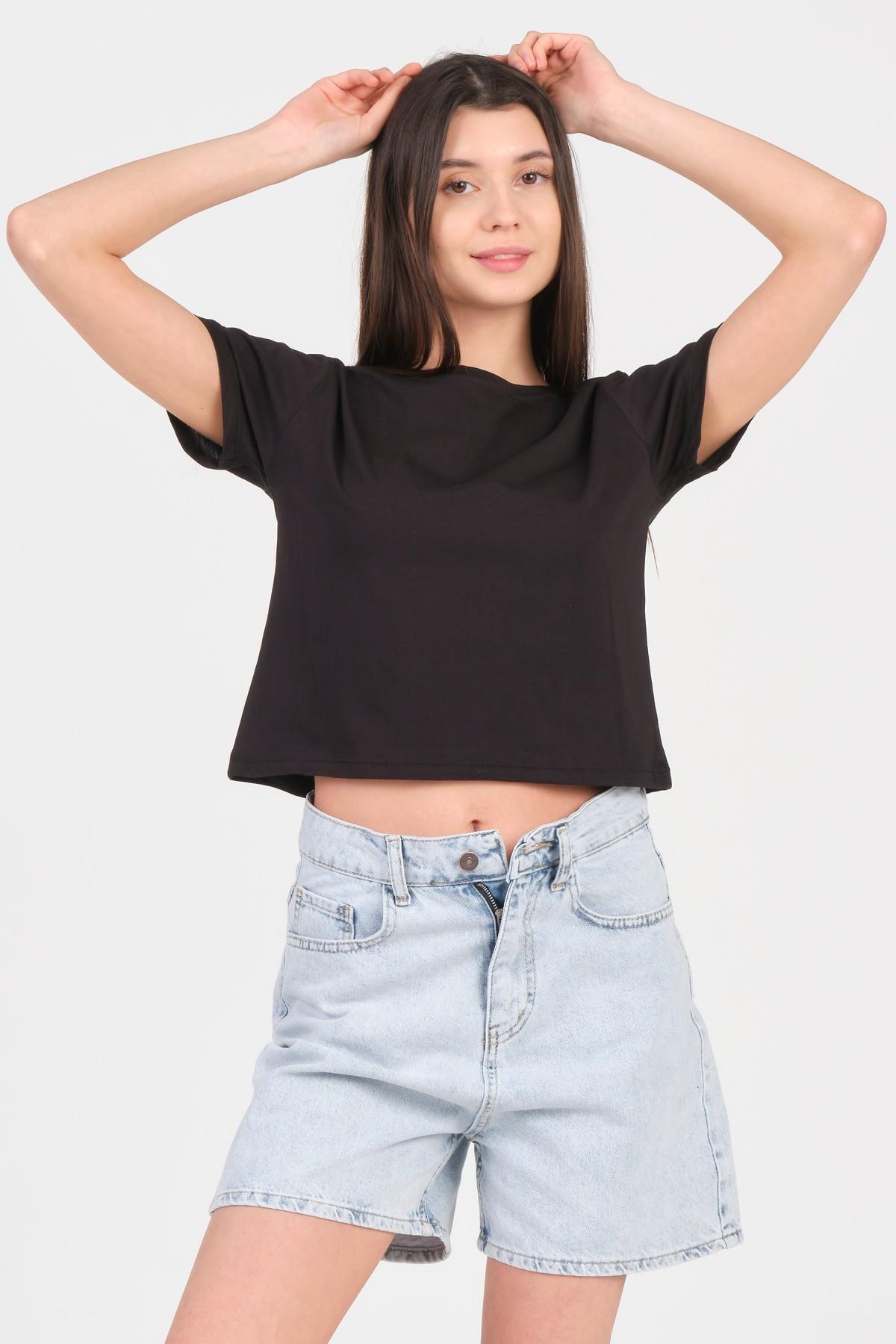 As Collection Siyah Bisiklet Yaka Kısa Kol Örme Kadın Crop (AS24012)