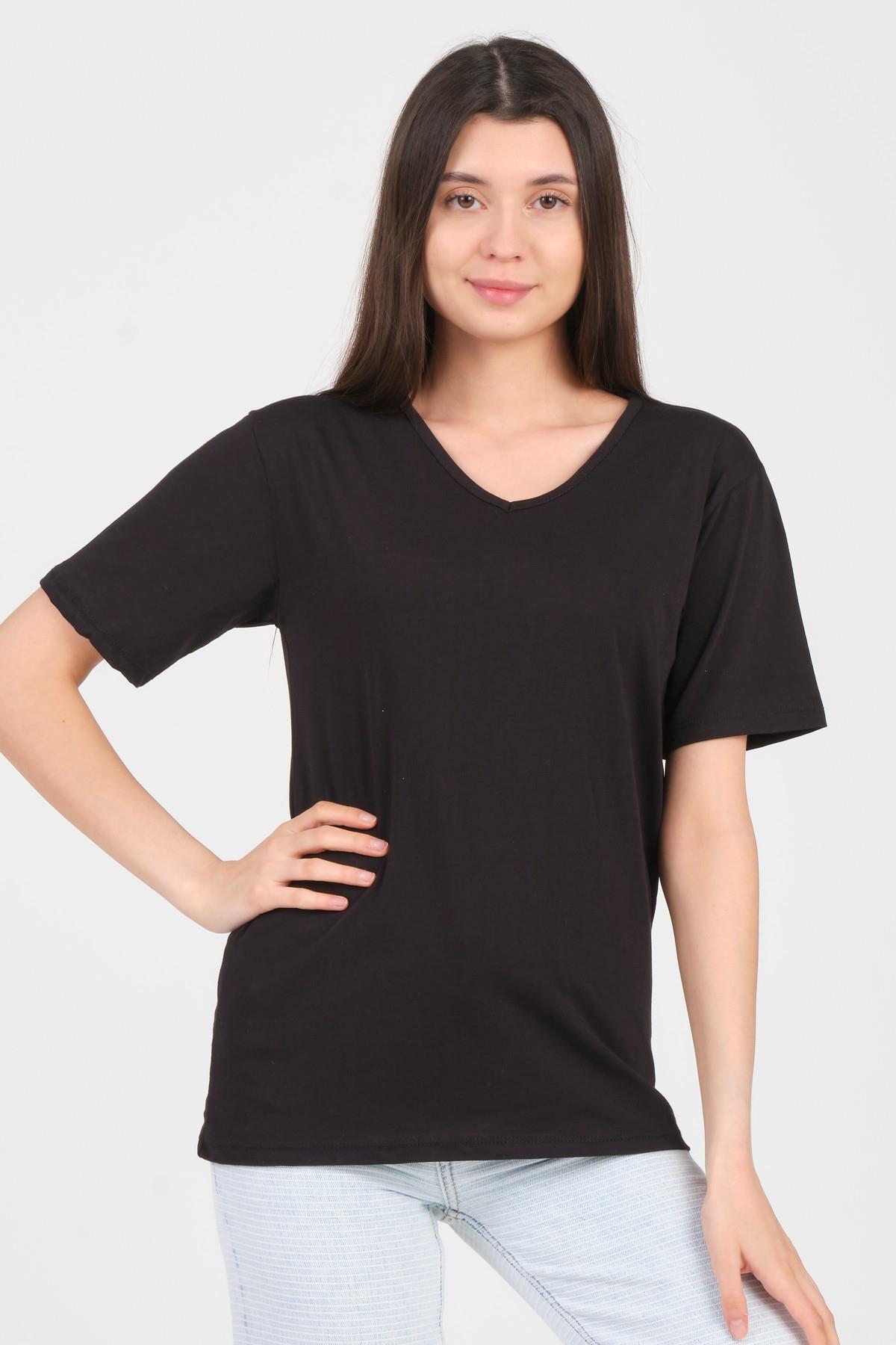 As Collection Siyah V Yaka Kısa Kol Örme Kadın T-Shirt (AS24008)