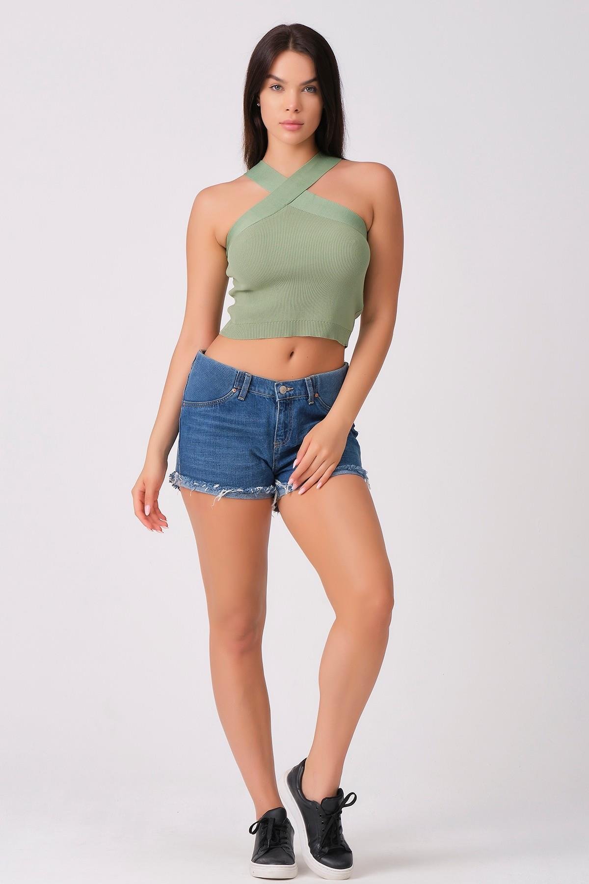 As Collection Yeşil Çapraz Yakalı Yazlık Triko Kadın Bluz (ASM010)
